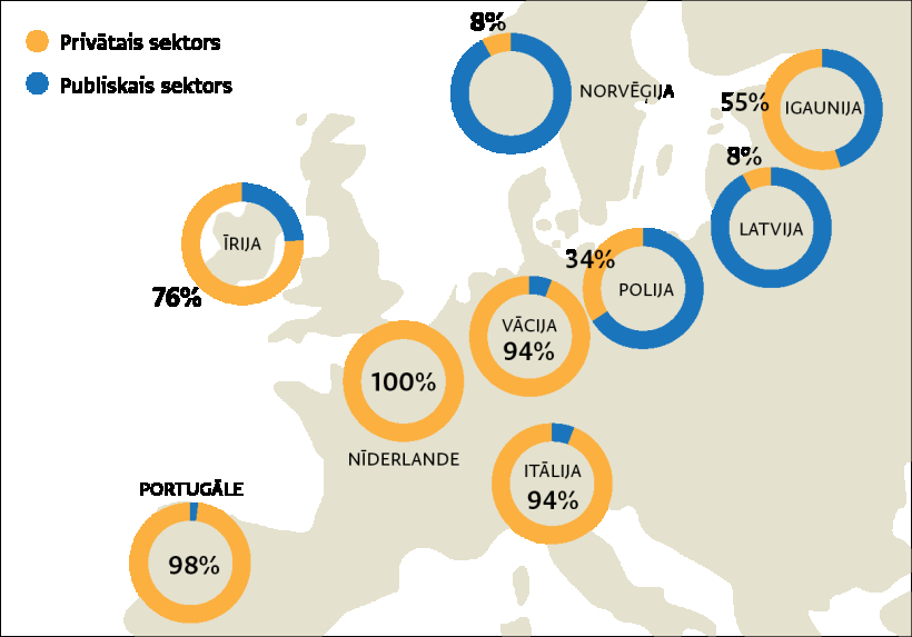 Latvija gan ir viena no retajām OECD valstīm, kur absolūti lielākā daļa ilgtermiņa aprūpes gultu pieder valsts un pašvaldību iestādēm. Šādas situācijas saknes meklējamas padomju okupācijas gados. Tomēr pēdējā laikā situācija mainās un tirgū ienāk aizvien vairāk privāto spēlētāju.