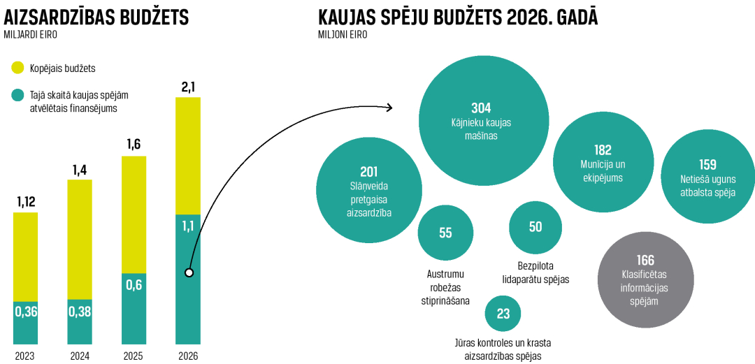 Šogad 1,14 miljardi eiro jeb 53% no aizsardzības budžeta līdzekļiem novirzīti bruņoto spēku kaujas spējām — vajadzībām, kas nepieciešamas, lai kara gadījumā pārciestu pirmo uzbrukuma vilni un apturētu pretinieku. Personāla izdevumi veido 21% no kopējā apjoma, uzturēšanas izdevumi — 17%, bet infrastruktūrā ieguldīsim 6%. Finansējuma pieaugums tieši kaujas spējām ir iespaidīgs — vēl 2023. gadā no kopējā aizsardzības budžeta kaujas spēju attīstībai novirzīja tikai trešo daļu jeb 366 miljonus.