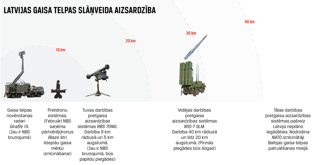Jau šogad gaidāmas pirmās vidējas darbības pretgaisa aizsardzības sistēmas IRIS-T, par kuru iegādi Latvija 600 miljonus eiro vērto līgumu ar Vācijas uzņēmumu Diehl Defence noslēdza 2023. gada rudenī. Sistēmas spēj iznīcināt ienaidnieka gaisa kuģus un dronus 40 kilometru rādiusā un līdz 20 kilometru augstumā.