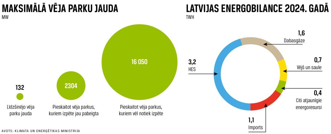 Lai gan savu jaudu jau ar šo vienu parku būsim dubultojuši, vēja enerģijas ražošanā joprojām krietni atpaliksim no Lietuvas. Pēc WindEurope datiem, šā gada vidū vēja enerģijas jauda Lietuvā sasniedza 1893 megavatus, Igaunijā — 711, bet Latvijā tikai 137. Turklāt oktobrī lietuvieši savu jaudu palielinājuši līdz 2467 megavatiem.