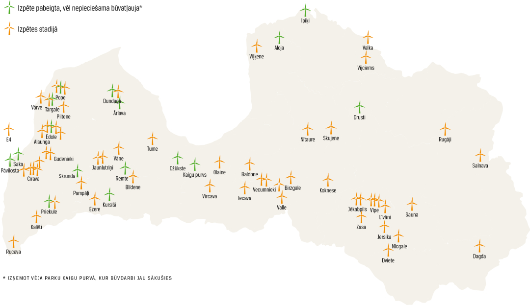 Vides novērtējumu vēl veic vēja parku iecerēm Tukuma un Balvu novadā, tas pabeigts divām iecerēm Saldus novadā, kur sākta lemšana par investīcijām. Skaidrs, ka no visām Latvijas vēja parku iecerēm īstenosies mazākā daļa, prognozē Lāce. Viņasprāt, 7—20%.