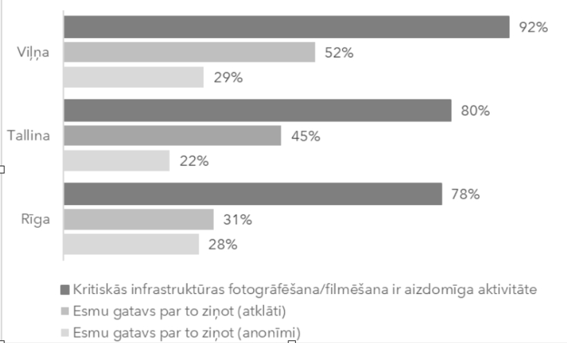 Līdz ar to svarīgi kļūst jautājumi – vai spējam atpazīt aizdomīgās aktivitātes un vai esam gatavi par tām ziņot atbildīgajiem dienestiem? Lai atbildētu uz šiem jautājumiem, šā gada februārī sadarbībā ar pētījumu aģentūru Norstat veicām reprezentatīvas Rīgas, Viļņas un Tallinas iedzīvotāju aptaujas.